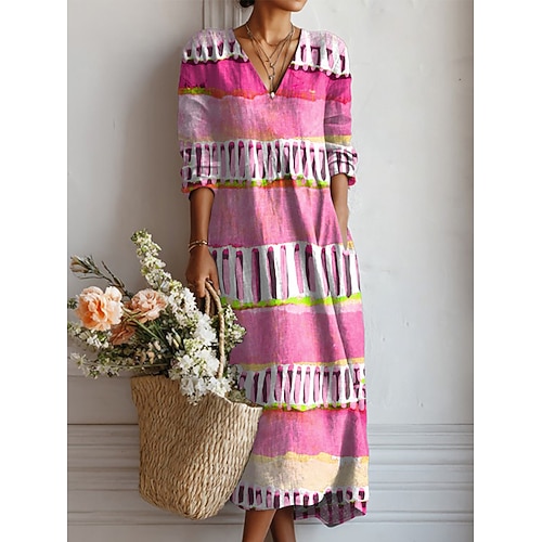 Abito Midi Donna V Neck Maniche Lunghe Kaftan Leggero Fit Largo Abito A-Line Casual Boho Festa Uscita Grafico Geometrico Strisce Maniche Lunghe V Neck Grigio Giallo Rosa Arancio