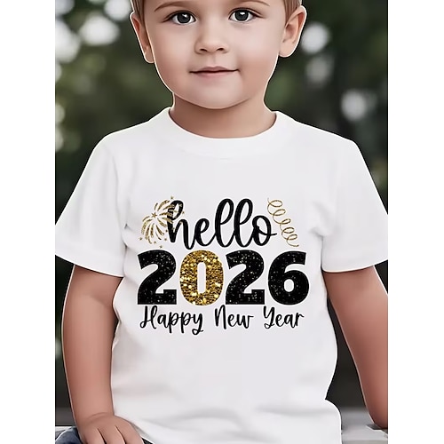 Maglietta con stampa 3D per la festa di Capodanno 2026, manica corta, stampa 3D, sportiva, estiva, primavera, moda, streetwear, per bambini dai 4 ai 12 anni, girocollo, casual, per tutti i giorni,