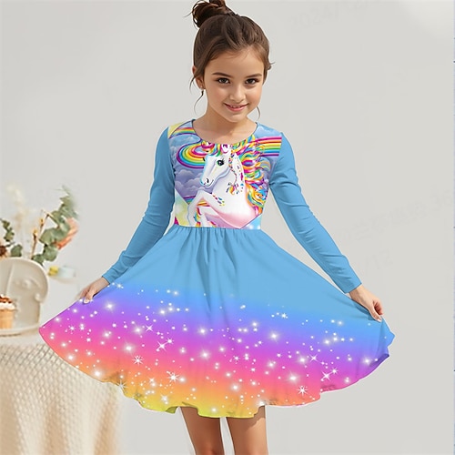 ragazze' 3D Unicorno Abito Manica Lunga Estate Primavera Vacanza Quotidiano Ferie Principessa Bello Dolce Bambini 4-12 Anni Vestito Casual Abito a trapezio Lunghezza al ginocchio Vestibilità regolare