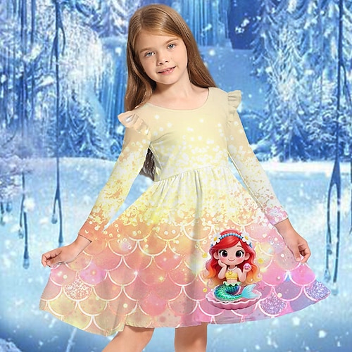 ragazze' 3D Cartoni animati Sirena Abito Vestito con Volant Manica Lunga Estate Primavera Vacanza Quotidiano Ferie Principessa Bello Dolce Bambini 4-12 Anni Vestito Casual Abito a trapezio Lunghezza
