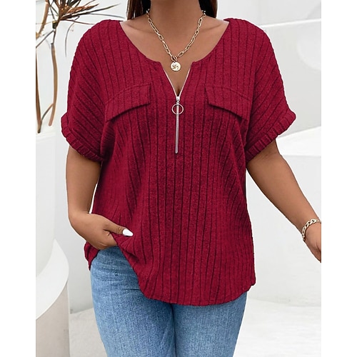 Per donna Maglietta Tinta unica Moda Classico Casual Manica Corta Scollo a V Top Regolari Quotidiano Uscire Weekend Zip a un quarto Blu Nero Vino Verde militare Cachi Estate Primavera