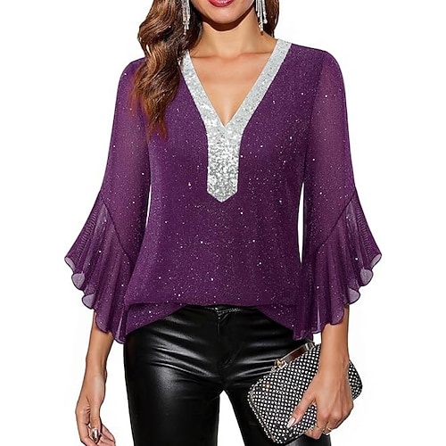 Per donna Blusa Top con paillettes Blocco di colori Elegante Moderno Manica 3/4 Manica a Campana Scollo a V Top Regolari Quotidiano Ferie Uscire Patchwork Blu Nero Rosso Viola Verde Estate Primavera