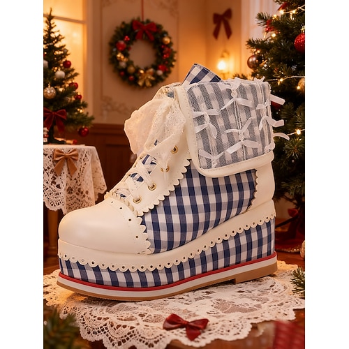stivali da donna con plateau e lacci a quadretti rossi – adorabile stile retrò con dettagli in pizzo e motivo a quadri per Natale, Lolita e festività invernali