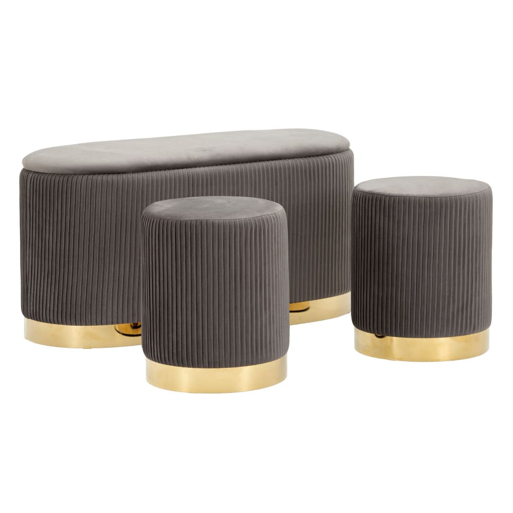 Panca con contenitore e pouf in velluto grigio e metallo oro