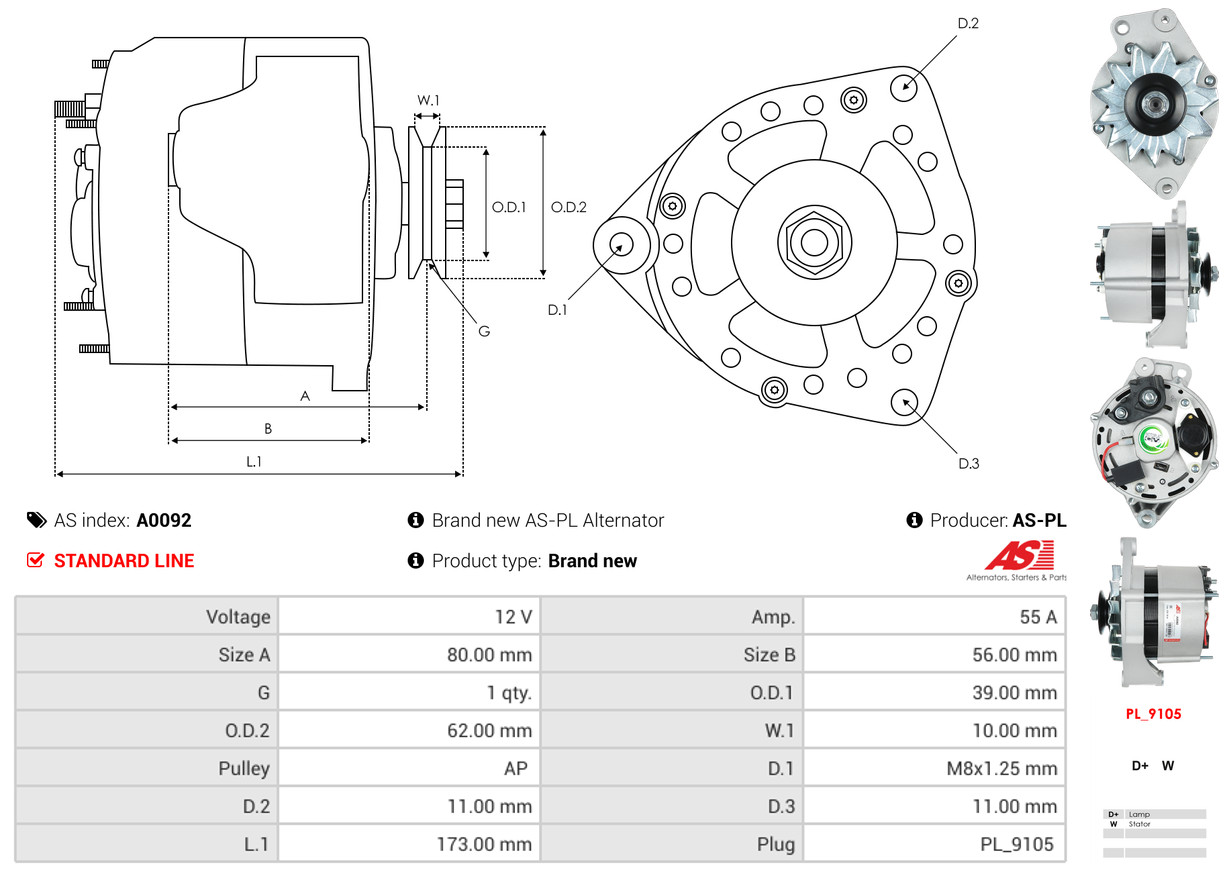 AS-PL Generator A0092 12V 55A für VW 068903031SX 036903027B 31903023B