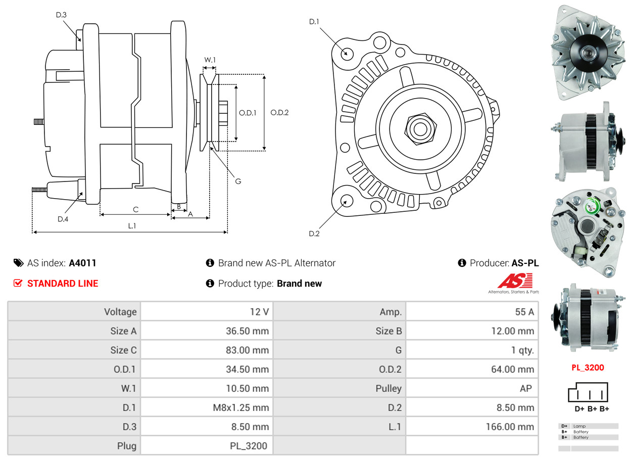 AS-PL Generator A4011 12V 55A für MITSUBISHI VW FORD ROVER 86AB10300ABA 054903015F 78903016A