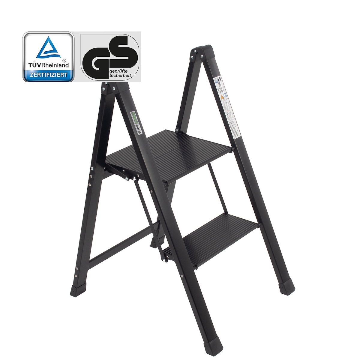 Trittleiter 2-stufig klappbar bis 150 kg Alu schwarz Anti-Rutsch Stufen TÜV/GS Klapptritt leicht 3kg