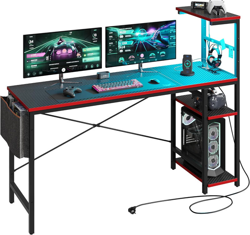 Bestier 155 cm Eck-Computertisch mit Steckdosen, Computertisch mit LED-Beleuchtung, Umkehrbarer Tisch mit Seitentasche, Aufbewahrungstasche & Zubehörhalter für Home Office, Kleine Räume, Schwarz