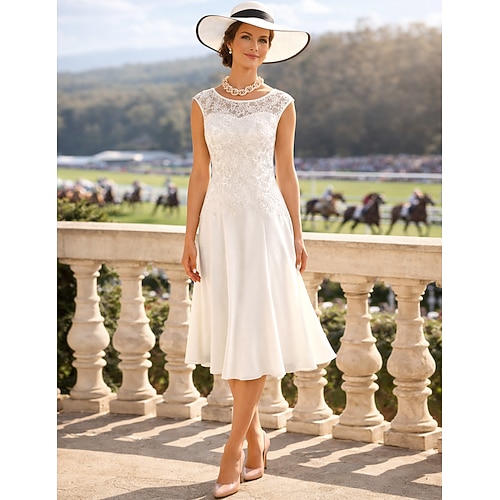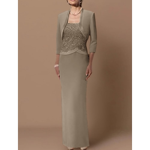 Due Pezzi Tubino Colonna Lunghezza al ginocchio Abito da invitata a nozze Abito da cerimonia per signora Manica 3/4 Collo gioiello Elegante Ospite di nozze Chiesa Chiffon Raso Pizzo Abiti Corti con