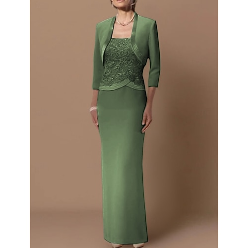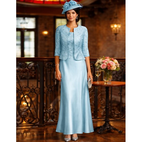 Tubino Colonna Lunghezza al pavimento Abito da invitata a nozze Abito da cerimonia per signora Manica 3/4 Scollo Tondo Elegante Ospite di nozze Abiti Corti con Giacca con Pizzo