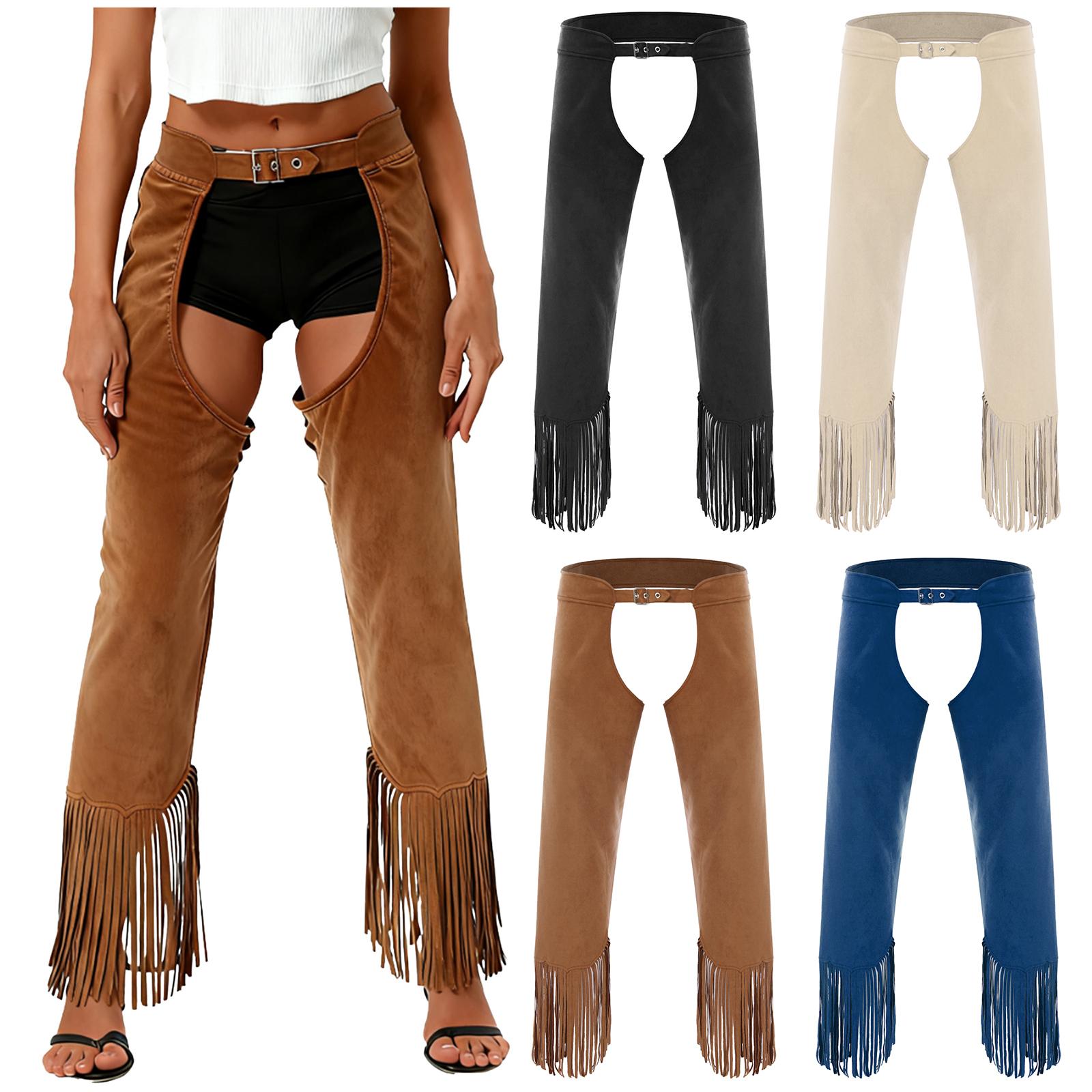 S-3XL Women Vintage Cowgirl Chaps Adjustable Buckles Open Crotch Split Fringe Suede Pants for Halloween Theme Party Cosplay cm blue
