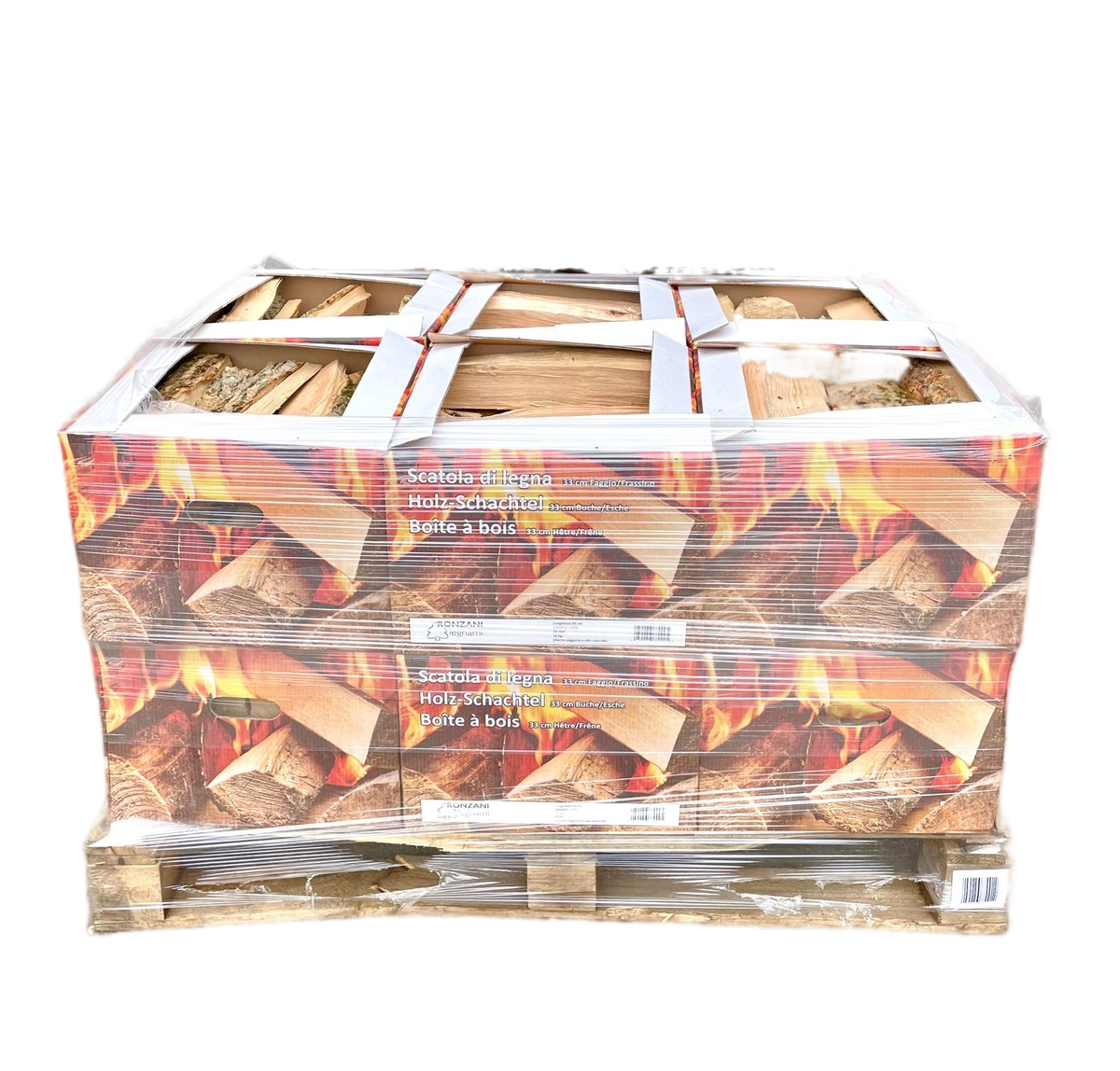 Brennholz aus buche und esche im 15-kg-schachtel. Palette 120x80x120 cm mit 24 Kisten mit Brennholz aus Buche und Esche.