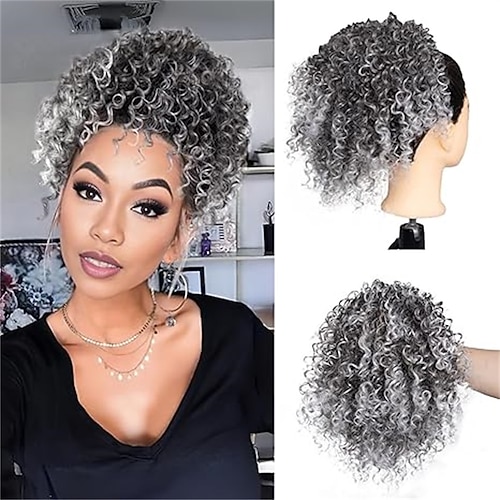 Extension per coda di cavallo corta, riccia e crespa, grigia con coulisse per donne nere, extension per coda di cavallo grigia con coulisse e sfumatura riccia, chignon spettinato grigio sintetico,