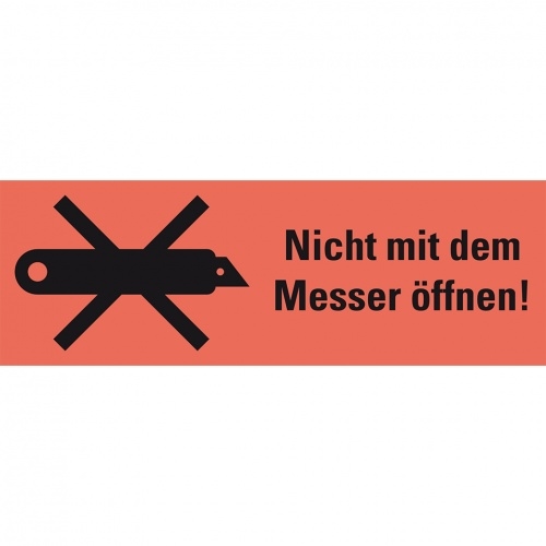 Aufkleber I Hinweisetikett N.mit dem Messer öffn., leuchtrot, Haftpapier, permanent, 147x50mm, 250/RO