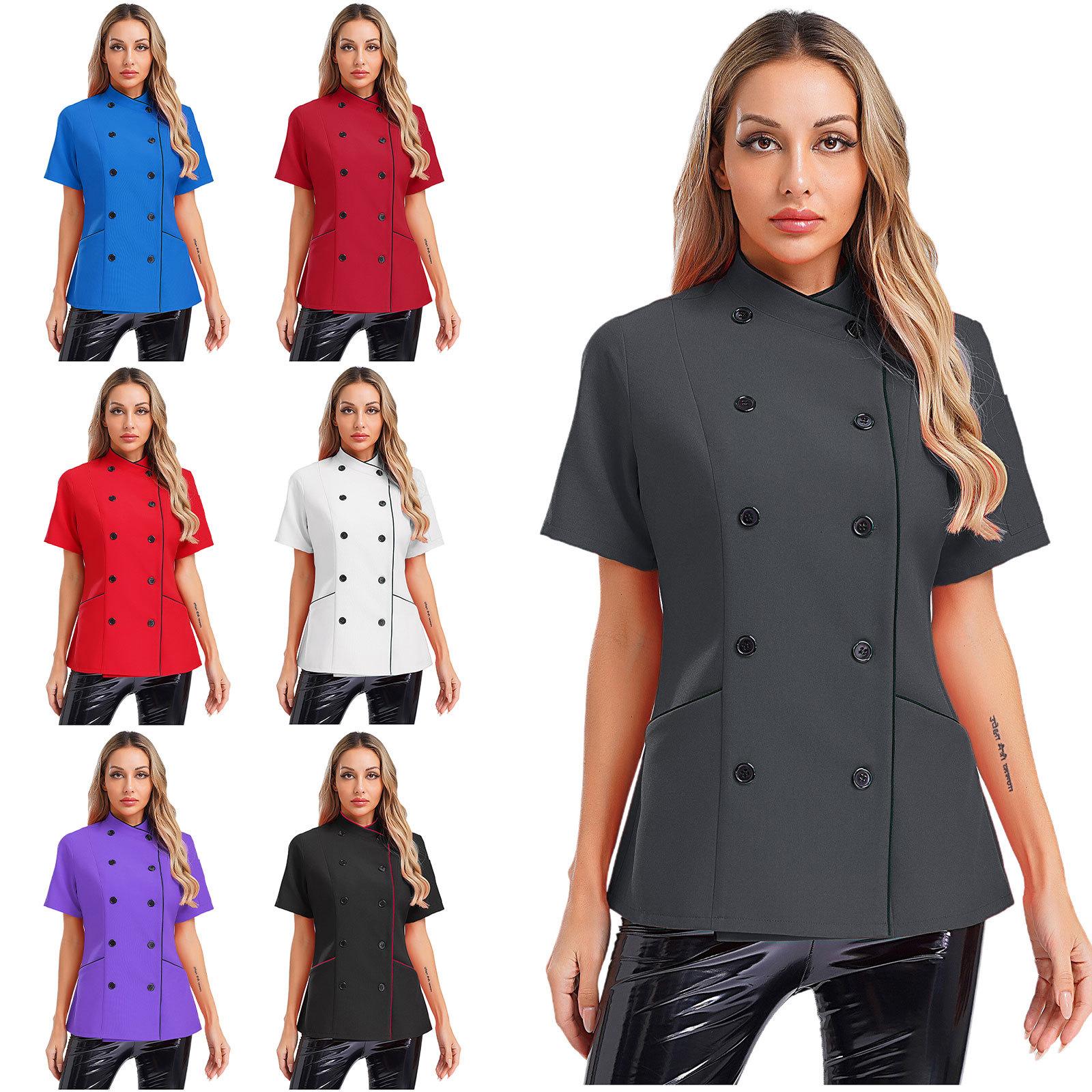 Women Chef Jacket Short Sleeve Cross Over Collar Double Breasted Design Kitchen Restaurant Professional Coat cm purple