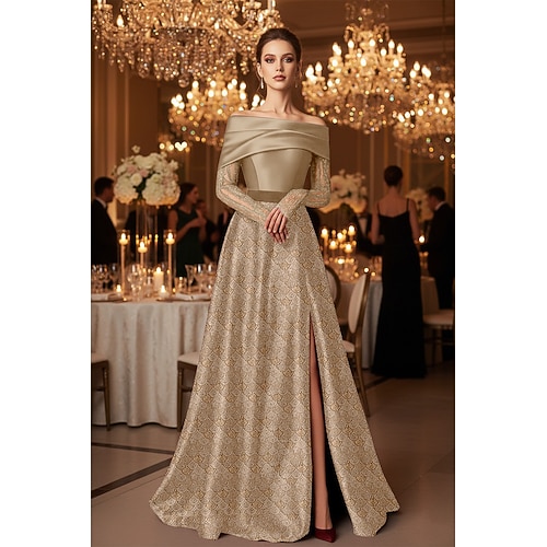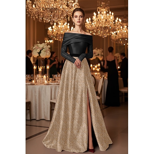 Abito da sera A-Line nero e oro jacquard con motivo a denti di cane elegante formale lungo fino al pavimento senza maniche scollato in satin con applicazioni di pizzo e plissettature con spacco