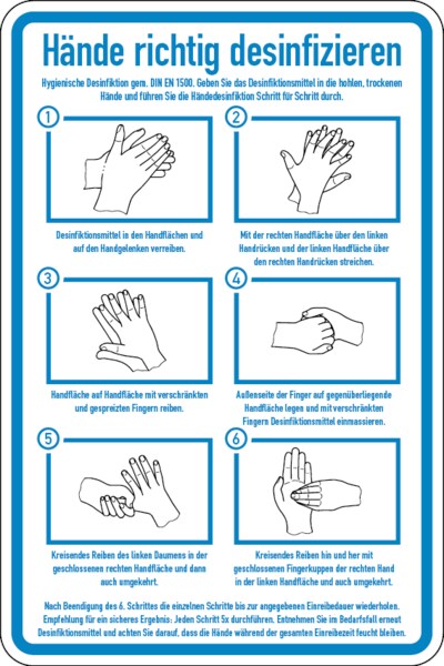 Hinweisschild, Hände richtig desinfizieren, 300 x 200 mm - DIN EN 1500 - 200x300x1.5 mm Kunststoff