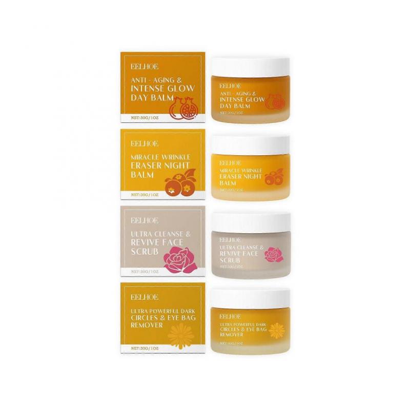 Organic Mature Women Skin Care Set - Rose Revive Face Scrub, Anti-Aging & Intense Glow Day Balm, Anti-wrinkle Night Balm, and Dark Circles & Eye Bag R