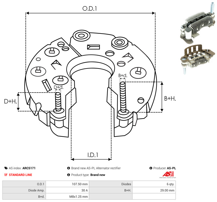 AS-PL Gleichrichter, Generator ARC5171 Universal 107,50mm für MITSUBISHI MAZDA FORD GYE1414 MD618811 FS11-18-W60