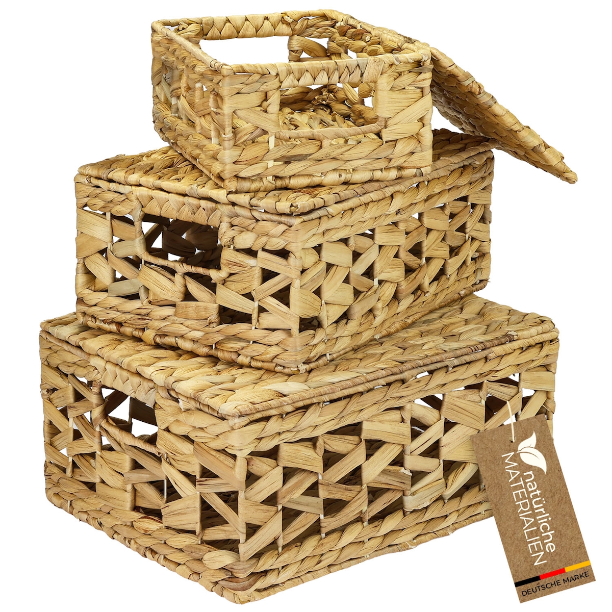 HMF Aufbewahrungskorb mit Deckel, 3er-Set, Korb geflochten aus Wasserhyazinthe, Klein, Mittel, Groß