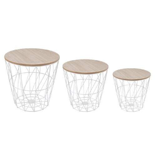 Lex Beistelltisch Set 3tlg Drahtkorb Stauraum Metallkorb weiß Platte Holz- hellbraun : Hell