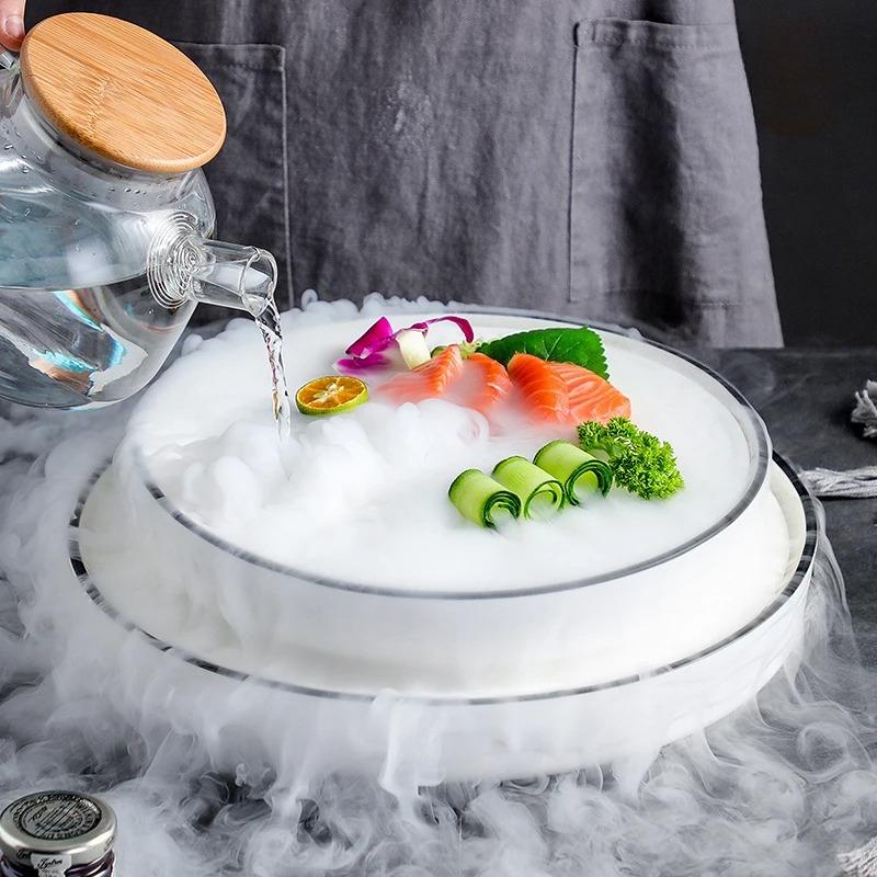 Creative Dry Ice Smoke Container Ceramic Cold Dish Tray Sashimi Dry Ice Plate Tableware Sushi Pan Characteristic Hotel Tableware