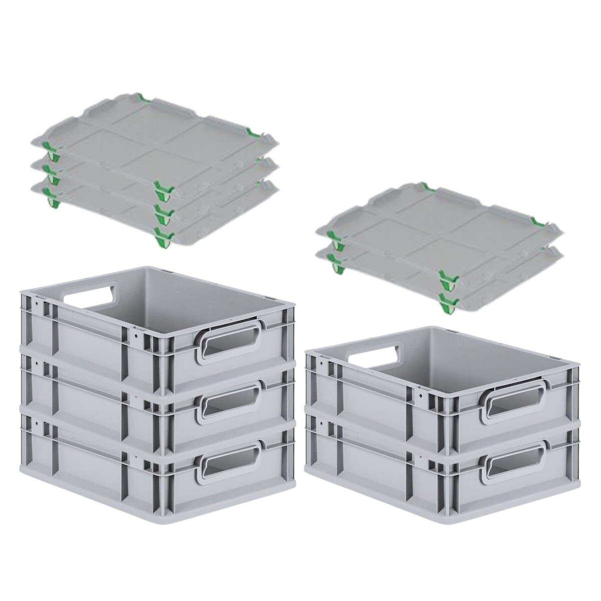 PROREGAL SparSet 5x Eurobox NextGen Economy mit Auflagedeckel & 4x Verschlüsse Grün, Griffe zu, HxBxT 22x40x60cm, 44L, Eurobehälter, Box