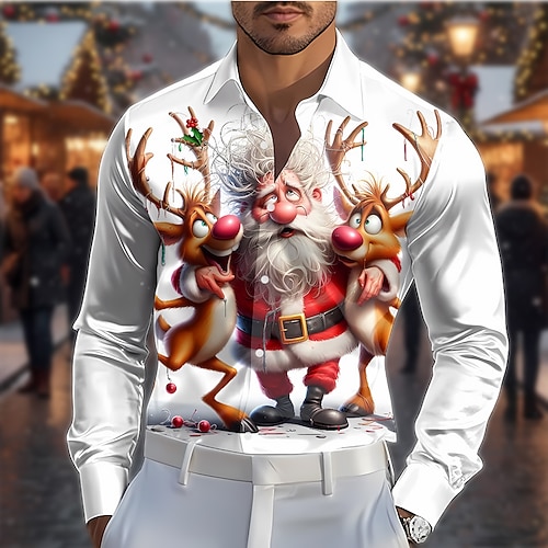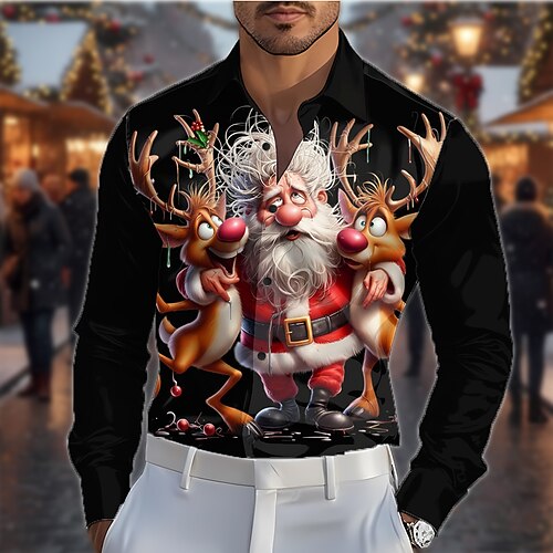 Natale Per uomo Babbo Natale Renna natale divertente Camicia Camicia in raso Camicia elegante Manica Lunga Moda Casual Feste Ferie Primavera Autunno Collo ripiegato Stampa 3D Camicie con bottoni Nero