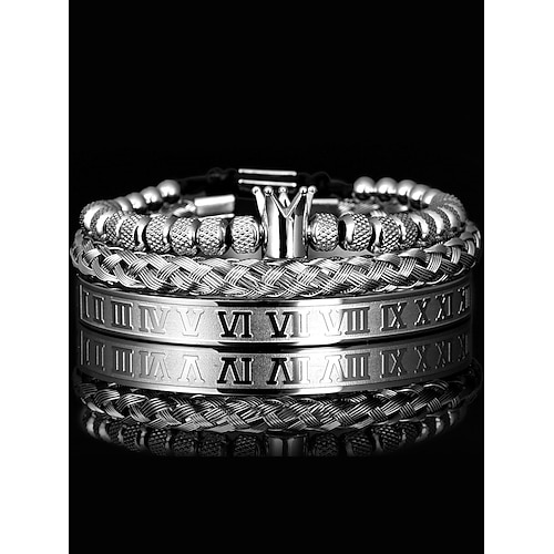 set di bracciali da uomo in acciaio inossidabile dorato: bracciale a 3 pezzi con corona di perline, polsino intrecciato e bracciale con numeri romani per abiti alla moda, feste e occasioni speciali