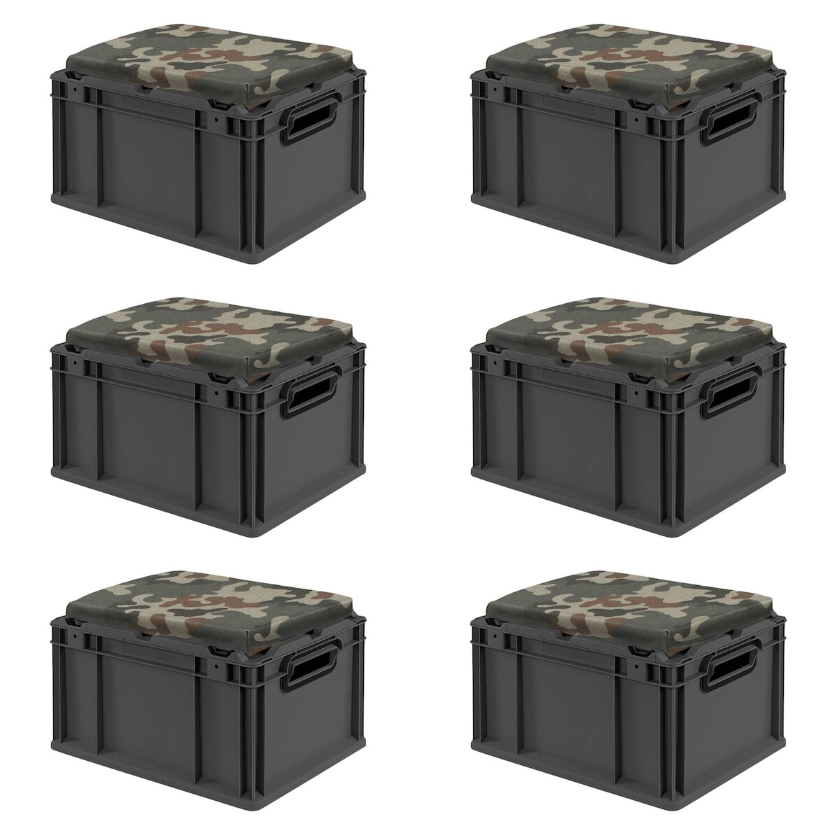 PROREGAL SparSet 6x Eurobox NextGen Seat Box Camouflage, HxBxT 26,5x30x40cm, 20 Liter, Griffe offen, Schwarz, Eurobehälter, Sitzbox, Transportbox