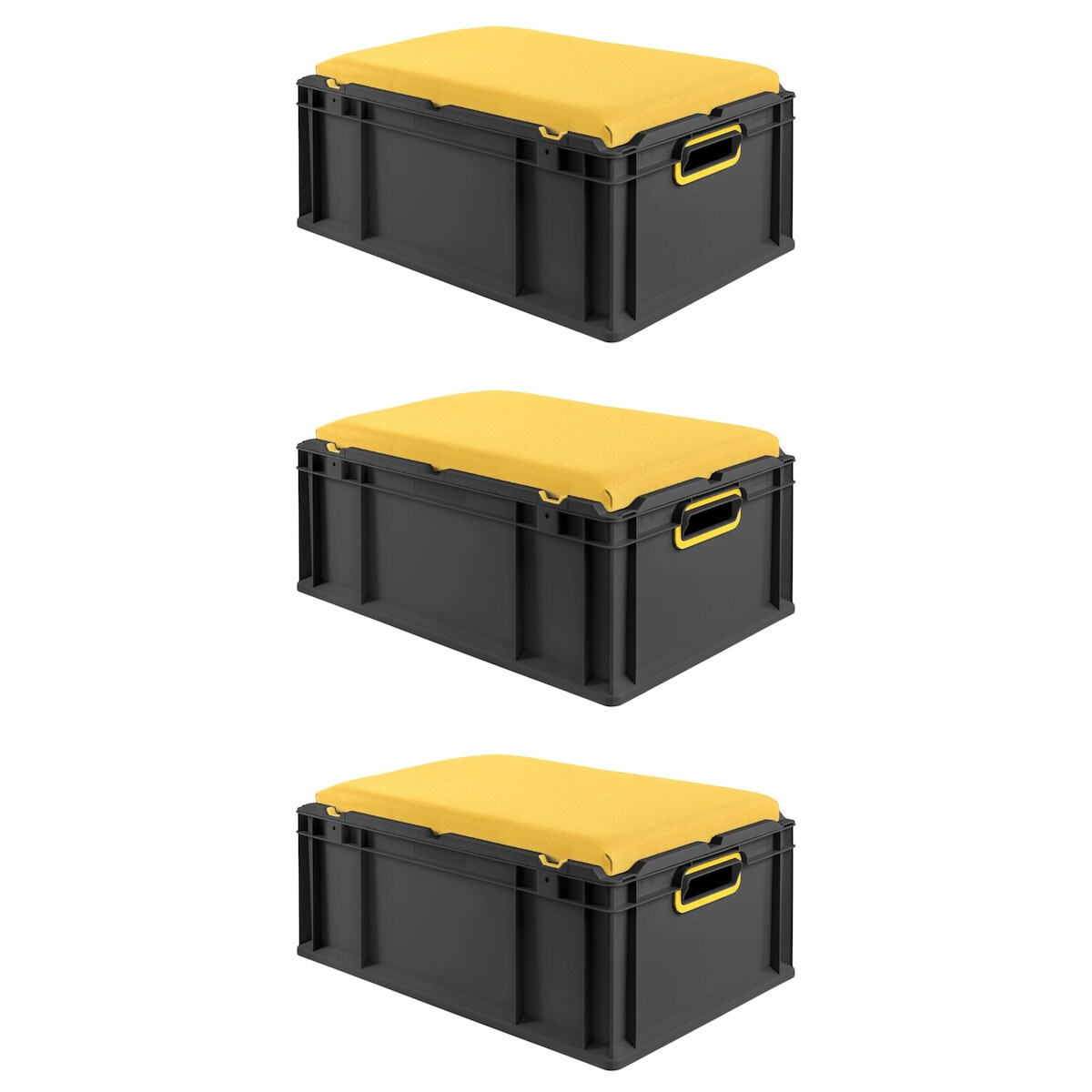 PROREGAL SparSet 3x Eurobox NextGen Seat Box Gelb, HxBxT 26,5x40x60cm, 44 Liter, Griffe offen, Schwarz, Eurobehälter, Sitzbox, Transportbox