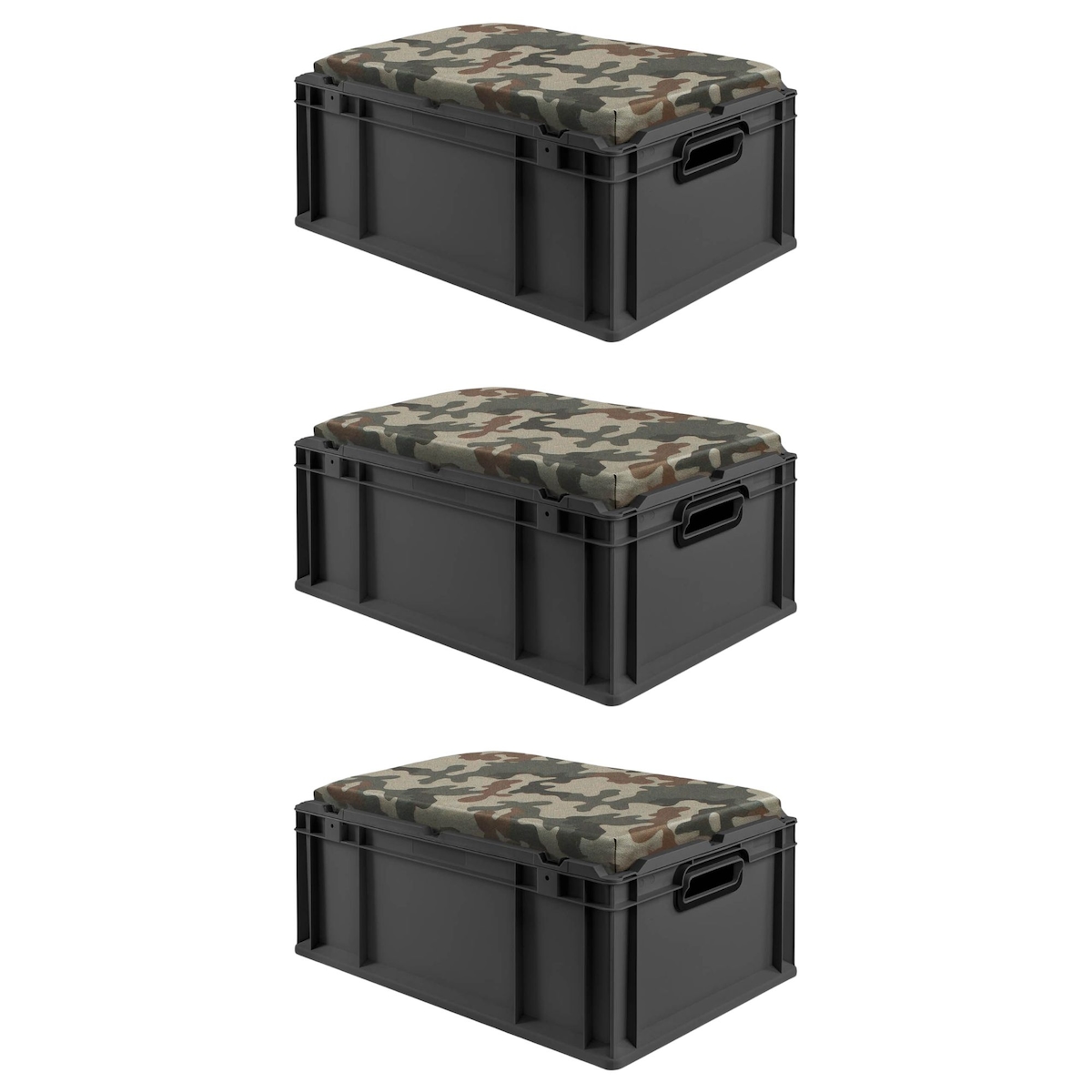 PROREGAL SparSet 3x Eurobox NextGen Seat Box Camouflage, HxBxT 26,5x40x60cm, 44 Liter, Griffe offen, Schwarz, Eurobehälter, Sitzbox, Transportbox