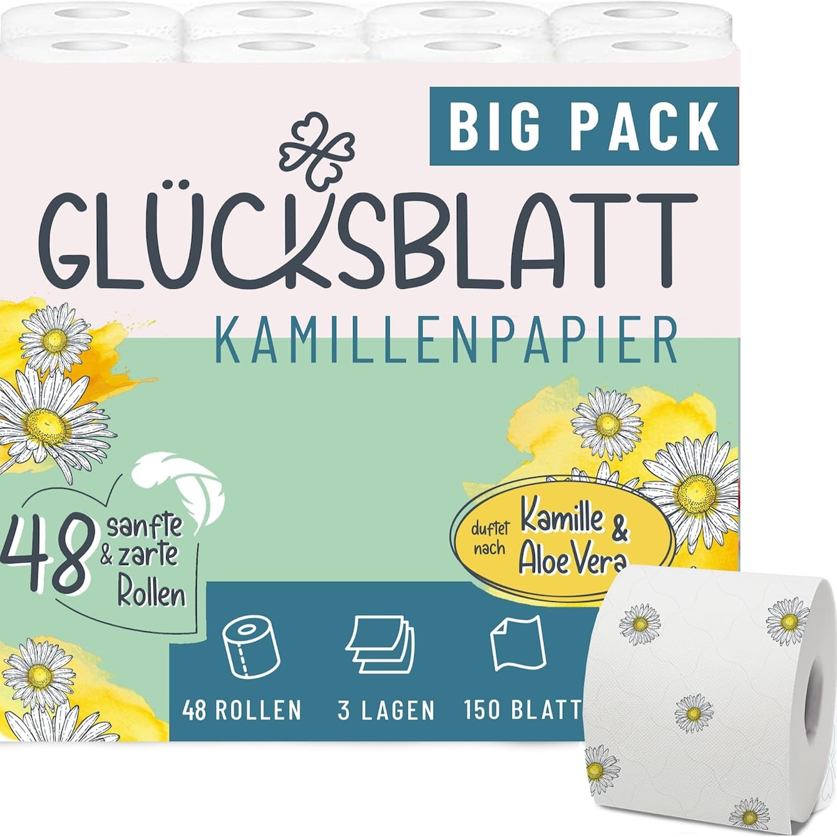 Glücksblatt Toilettenpapier KAMILLE, 3-lagig, 48 Rollen x 150 Blatt, Duft nach Kamille, 100% Zellstoff, mit bunten Kamillenblüten, Kamillenpapier