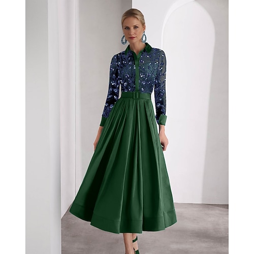 Linea ad A Lunghezza alla caviglia Abito Camicia Vestito da Festa Abito da Cocktail Abito da cerimonia per signora Manica Lunga Colletto a Camicia Elegante Matrimonio Formale Taffetà con Pieghe Spacco