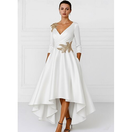 Linea ad A Asimmetrico Vestito da Festa Abito da Cocktail Abito da invitata a nozze Abito da cerimonia per signora Manica Lunga Scollo a V Elegante Formale Raso con Applicazioni
