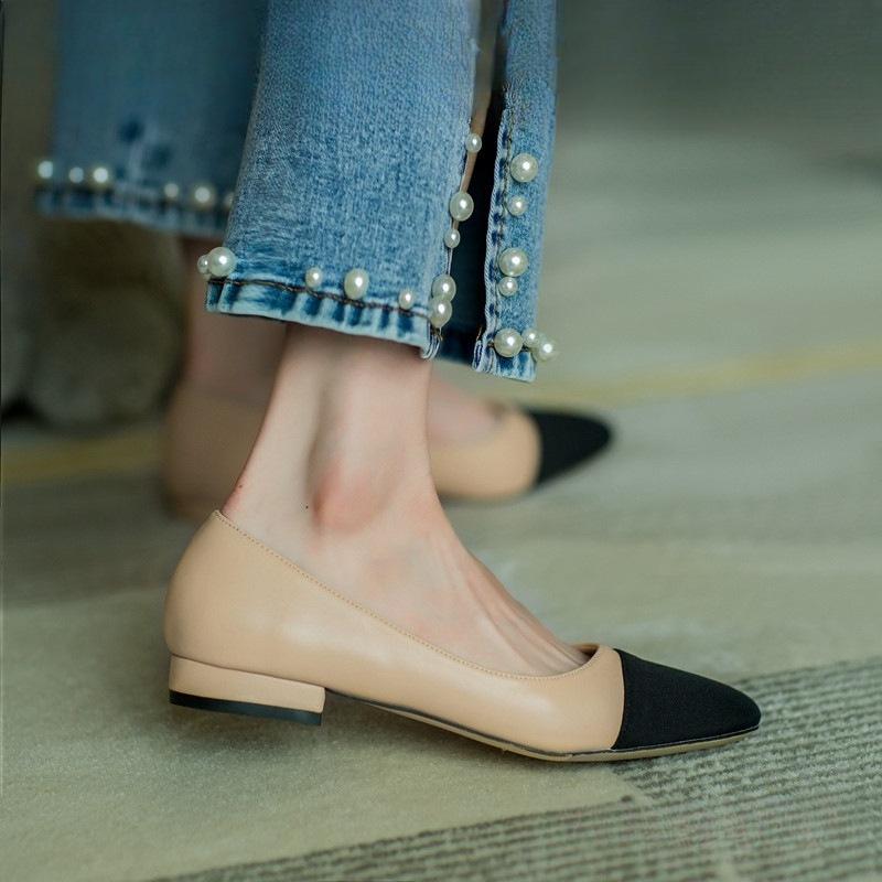Soft leather color matching sandals flat thick heel high heels French 2025 new light mouth single shoes women's spring middle heel cm