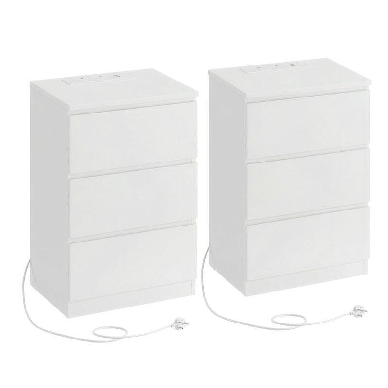 SONGMICSHOME Set of 2 Nightstands with Charging Station, Bedside Tables, Side End Tables with 3 Drawers, for Bedroom, White