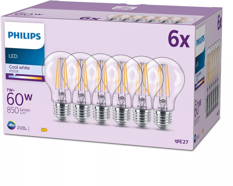 Philips LED Lamp Transparant - 60 W - E27 - Koelwit licht - 6 stuks