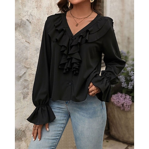 Per donna Camicia Elegant Elegante Raso/Satin Tinta unica Semplice Elegante Essenziale Classico Manica Lunga Scollo a V Top Regolari Lavoro Quotidiano Ferie Arricciato Volant Bottoni Nero Autunno