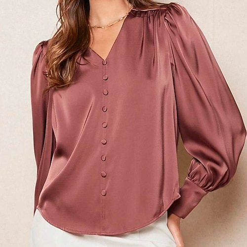Per donna Elegant Elegante Raso/Satin Blusa Semplice Elegante Casual Manica Lunga Scollo a V Top Regolari Quotidiano Bottoni Nero Vino Blu Marrone Autunno