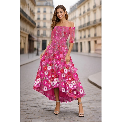 Linea ad A Lunghezza Tè Abiti da Cocktail Elegante Stile Celebrità Alto Basso Mezza Manica Senza Spalle Festa in giardino Matrimonio Pizzo con Ricamo Applicazioni