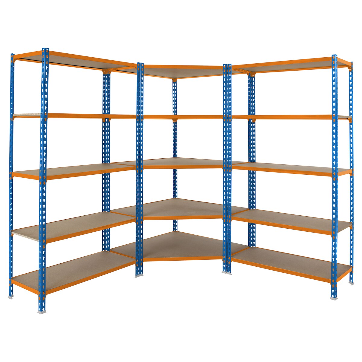 SimonRack Maderclick Eckregal aus Metall ohne Schrauben, 5 Böden + 2 Maderclick-Regale. Farbe BLAU/ORANGE/HOLZ 1800x1800x500 mm