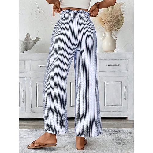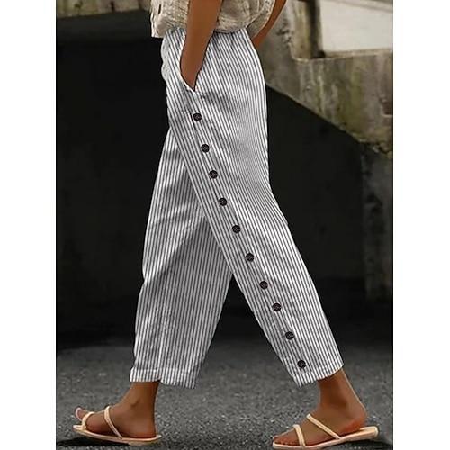 Pantaloni da Donna in Lino Pantaloni Estivi Pantaloni da Spiaggia Vacanza Moda Base Lunghezza Totale Vita Media Semplice Strisce Tasche Laterali Comfort Inelastico Casual per le Vacanze Grigio Chiaro