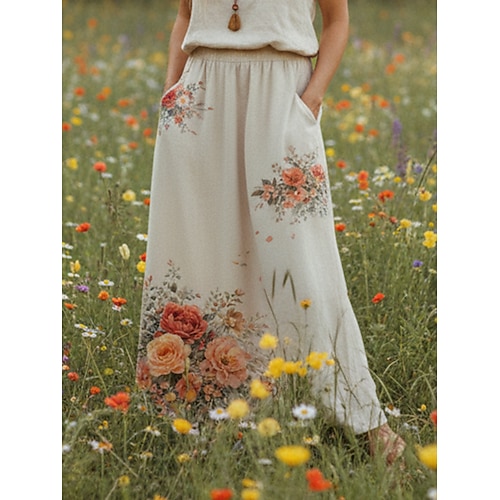 gonna da vacanza da donna bohémien vintage moda casual maxi gonne a vita media stampa floreale anelastica quotidiana strada kaki beige estate