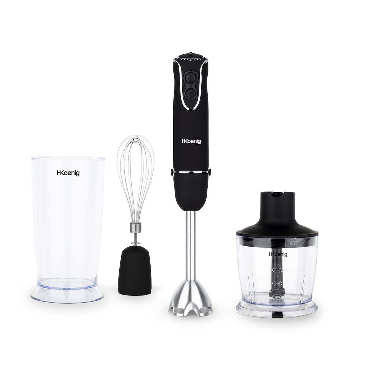 H.Koenig MIX75 Stabmixer-Set / Mixbecher, Schneebesen und Pürierstab / 5 Geschwindigkeitsstufen / 750 W / Spülmaschinenfest / Edelstahl / schwarz