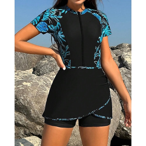 Per donna Top sottomuta Costume da bagno Costume da Bagno Floreale Costumi da bagno Nero / bianco Nero Protezione UV Controllo addominale Surf Spiaggia Vacanze Estate Taglie Forti