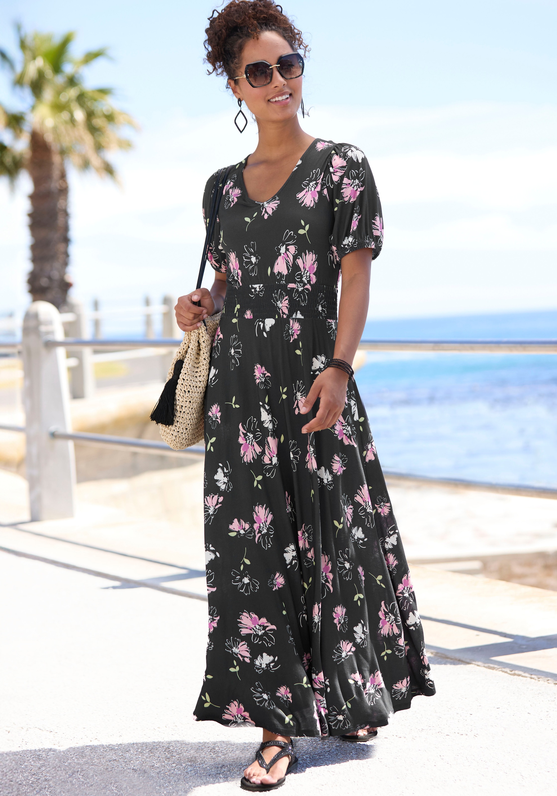 Maxikleid VIVANCE, Damen, Gr. 40, N-Gr, schwarz, mauve bedruckt, Jersey, Obermaterial: 100% Viskose, bedruckt, geblümt, modisch, figurumspielend knöchelfrei, V-Ausschnitt, Kurzarm mit innenliegendem Gummizug, Kleider