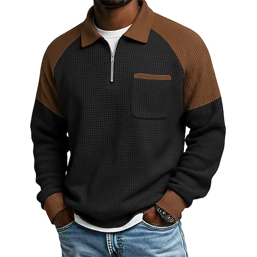 Per uomo Maglietta Waffle Polo con zip Manica Lunga Colletto Polo Maglione Zip a un quarto Autunno Autunno Inverno Tinta unica Blocco di colori Tradizionale / Vintage Casual Patchwork Blocco di