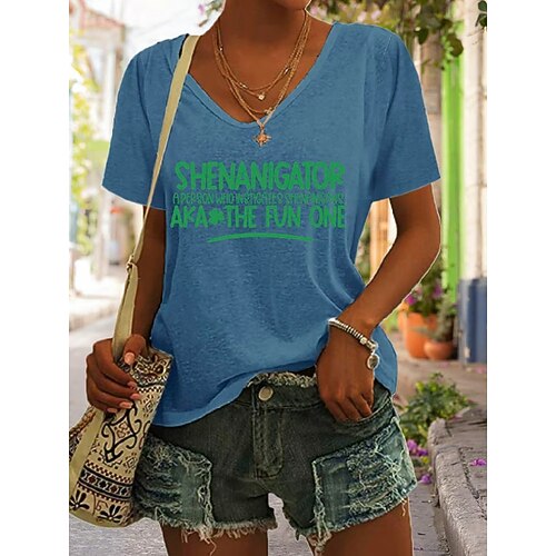 T-shirt da donna con motivo grafico a trifoglio, stile vintage, classica, elegante, manica corta, scollo a V, regular, stampa quotidiana, blu, nero, bianco, verde, grigio, estate, primavera
