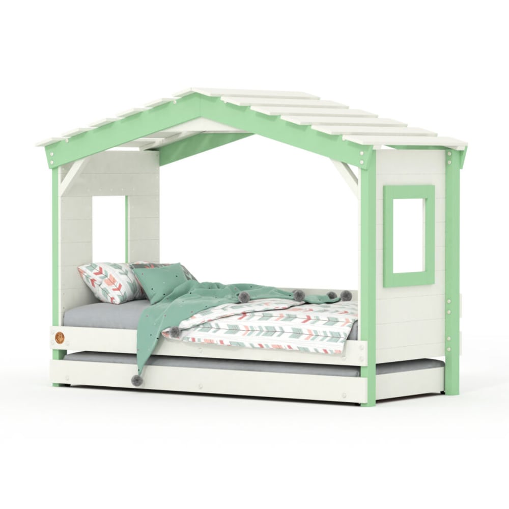Letto a casetta verde e letto estraibile in pino massiccio